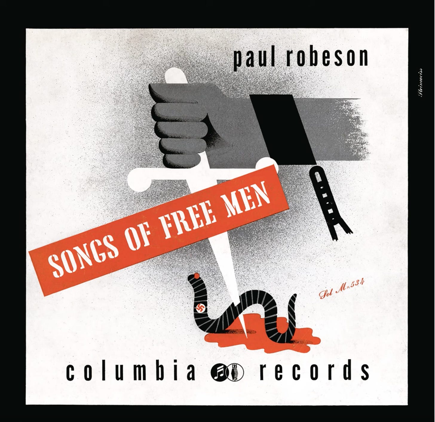 Click on the LP cover to hear “Joe Hill”. Columbia Records used this graphic as Robeson’s album cover, created by designer Alex Steinweiss, released in 1943, the height of Hitler’s cruelty. Of Nazi concentration camps and mass exterminations, Baba Yar, the murder of Poland’s Jews, etc. These were days when the gatekeepers of culture, e.g. Columbia Records, actually cared about humanity and were brave enough to protest, to release a graphic like this. The American government was very slow to respond to Hitler’s evil. Sadly, no surprise there… and today the Nazis are buying up the media.